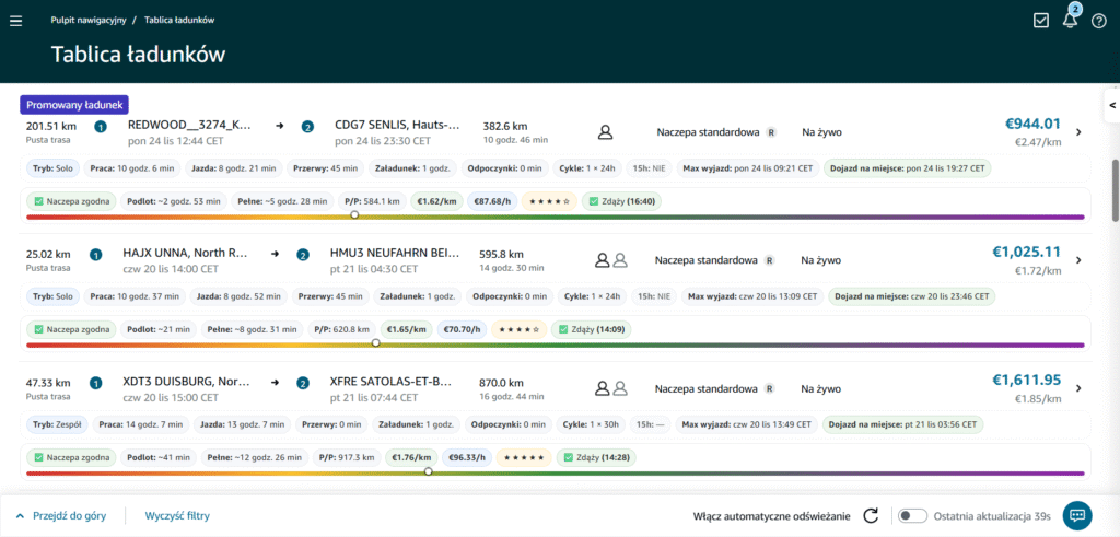 RelayDispo prowadzi Twoje ciężarówki w Amazon Relay tak, jak własne. Filtrujemy „szum” z tablicy, analizujemy czas pracy kierowców, stawki i realną trasę na mapach dla ciężarówek, a następnie wybieramy tylko zlecenia, które są zgodne z przepisami i faktycznie się opłacają.
